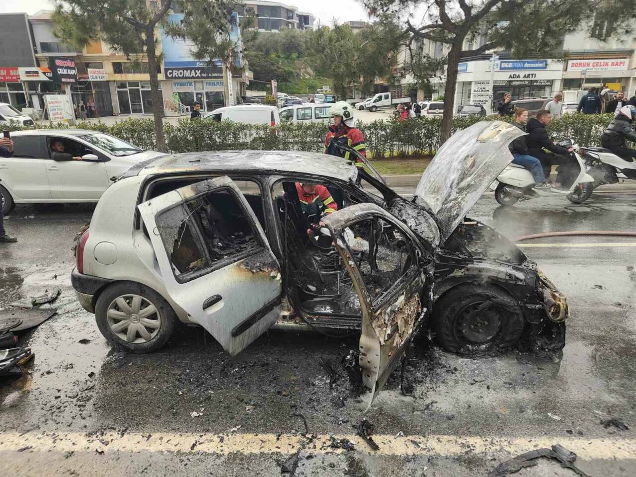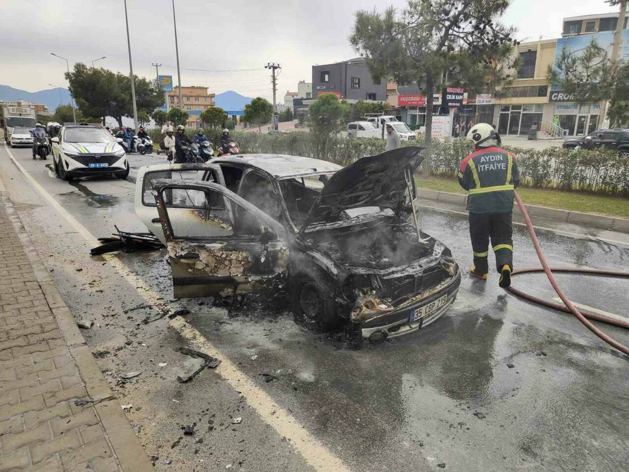Olay, Kuşadası ilçesi Süleyman Demirel Bulvarı üzerinde meydana geldi. Edinilen bilgiye göre seyir halindeki 35 CBP 219 plakalı otomobilin sürücüsü E.E., motor kısmından yükselen dumanları fark edince aracını durdurarak 112 Acil Çağrı Merkezi’ne ihbarda bulundu. O esnada araçtan alevler yükseldi. Kısa sürede büyüyen alevler aracı tamamen sardı. İhbar üzerine bölgeye sevk edilen itfaiye ekiplerinin müdahalesiyle yangın söndürüldü. Ekipler soğutma çalışması gerçekleştirirken, otomobil kullanılamaz hale geldi.