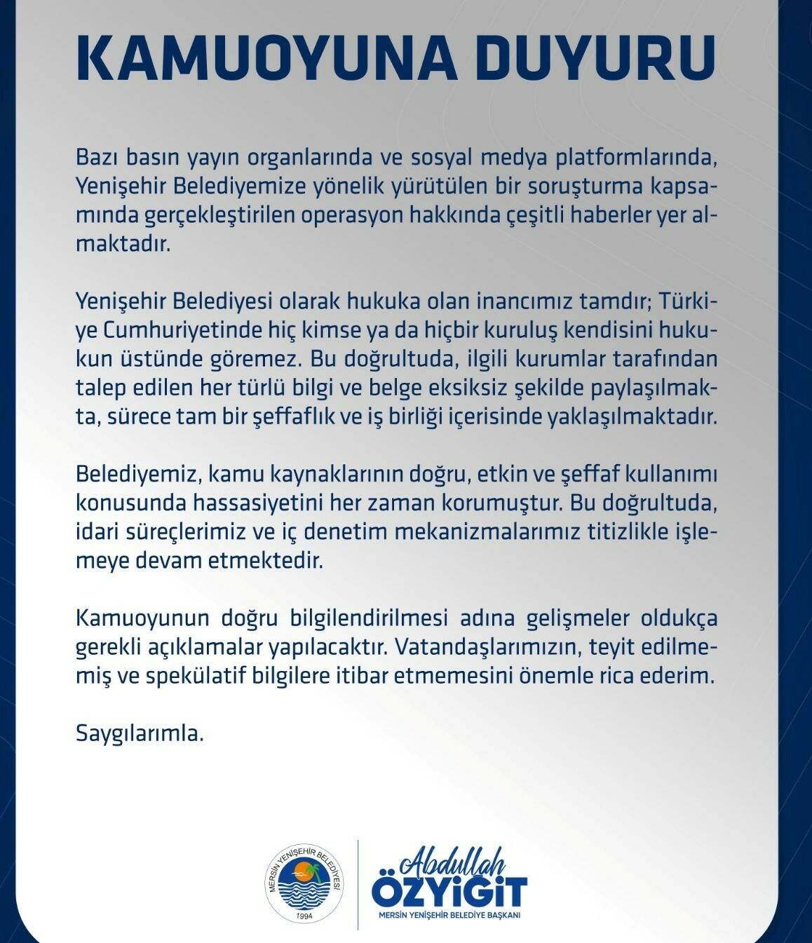 Mersin’in merkez ilçe Yenişehir Belediyesine yönelik yürütülen soruşturma kapsamında gerçekleştirilen operasyonla ilgili Yenişehir Belediye Başkanı Abdullah Özyiğit yazılı bir açıklama yaptı. Özyiğit, hukuka olan inançlarının tam olduğunu belirterek sürece şeffaflık ve iş birliği içinde yaklaştıklarını ifade etti.