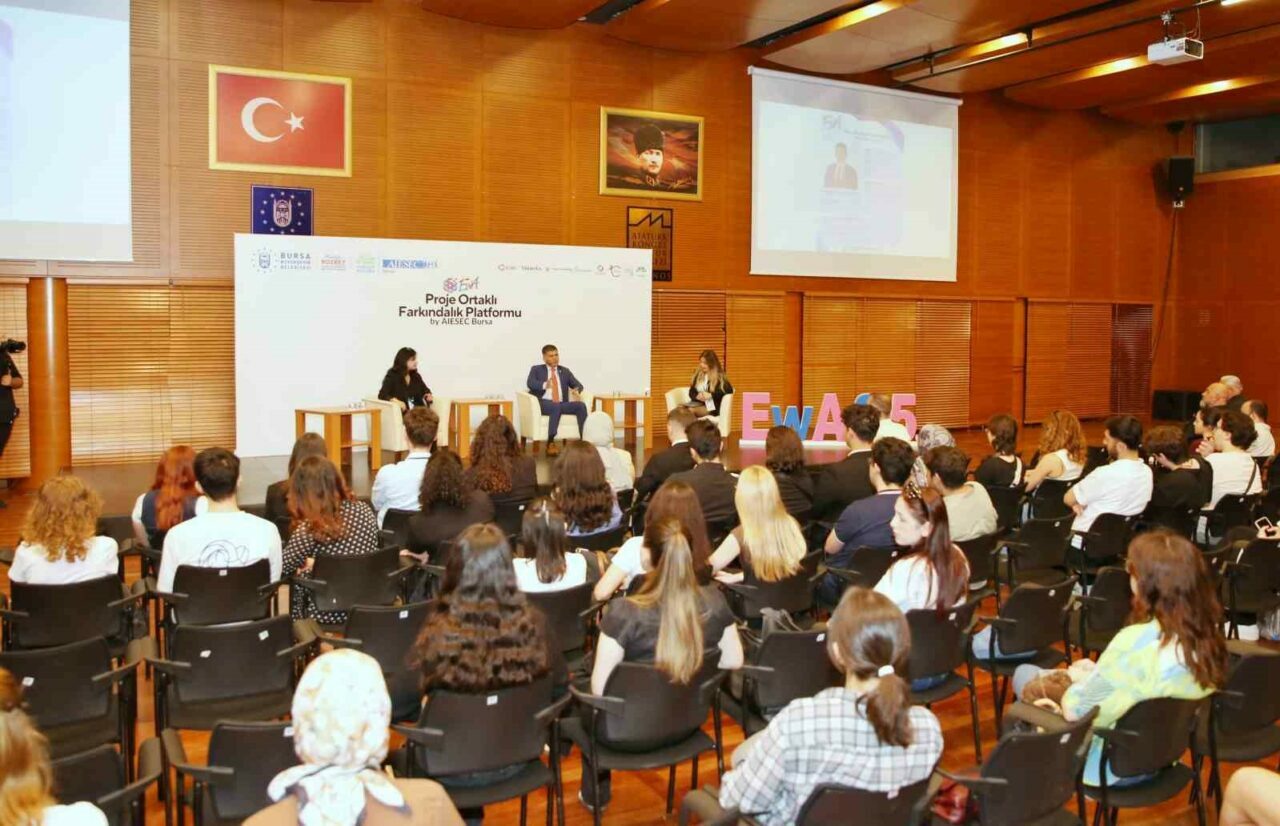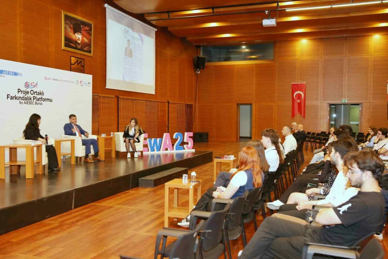 AIESEC Bursa tarafından gençlerin liderlik potansiyelini artırmak, firmalara marka bilinirliği kazandırmak, sosyal sorumluluklarını göstermek ve yetenekli gençlerle buluşma fırsatı sunmak amacıyla “Proje Ortaklı Farkındalık Platformu” etkinliği düzenleniyor. Atatürk Kültür Merkezi Merinos Yerleşkesi’nde düzenlenen etkinliğin son konuğu, Bursa Büyükşehir Belediyesi Genel Sekreteri Doç. Dr. Ergül Halisçelik oldu. Programda gençlerin sürdürülebilirlik üzerine sorularını yanıtlayan Doç. Dr. Ergül Halisçelik, gençlerle bir arada olmaktan büyük mutluluk duyduğunu dile getirdi. Kendisinin de 7-8 üniversitede ders vererek binlerce öğrenci yetiştirdiğini söyleyen Halisçelik, “Öğrencilerimizle sürdürülebilirlik üzerine sohbet ettik. Ben de doktora tezimi sürdürülebilir kalkınma üzerine yapmıştım. Umarım bizler de onların kariyer planlamalarına ve yolculuklarına katkı sağlarız. Sürdürülebilirlik geleceği de baz alan kuşaklar arası bir sorundur. Bugün aldığımız veya dün almadığımız her karar bugünü ve geleceği etkiliyor. Her alanda sürdürülebilirlik üzerine çalışma yapılıyor. Gelecek nesillerin ihtiyaçlarını da heba etmeden kaynaklarımızı doğru kullanmamız gerekiyor” dedi.