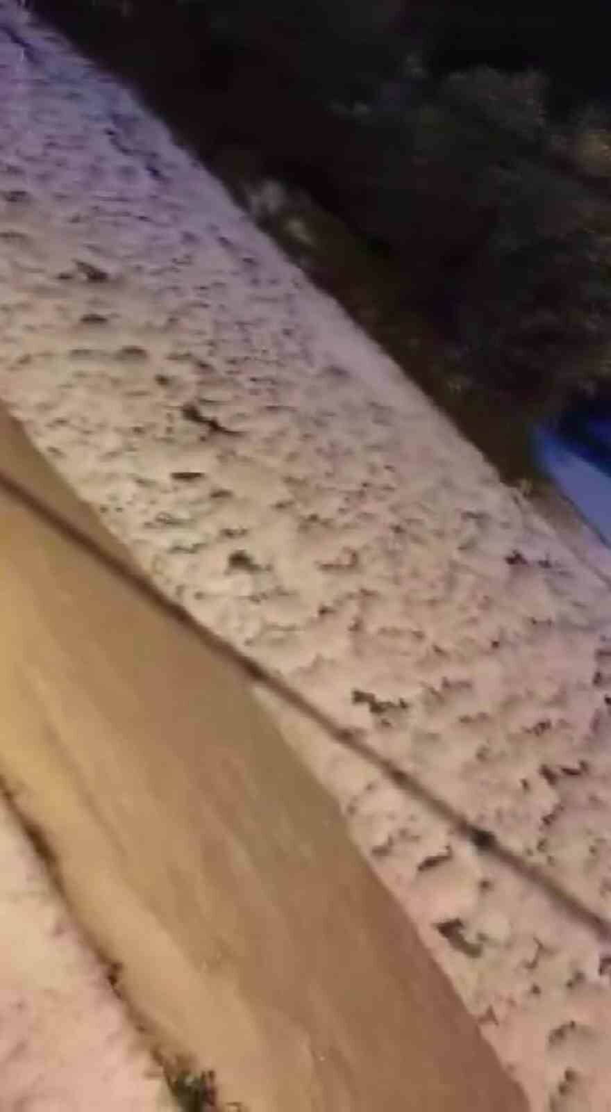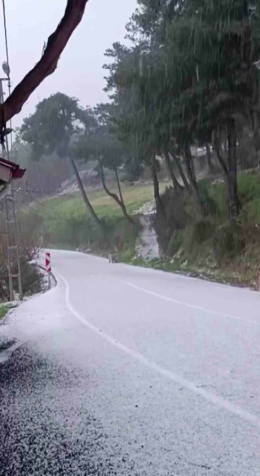 Hatay’da sabahın ilk ışıklarıyla etkili olan dolu yağışı çevreyi beyaza bürüdü.