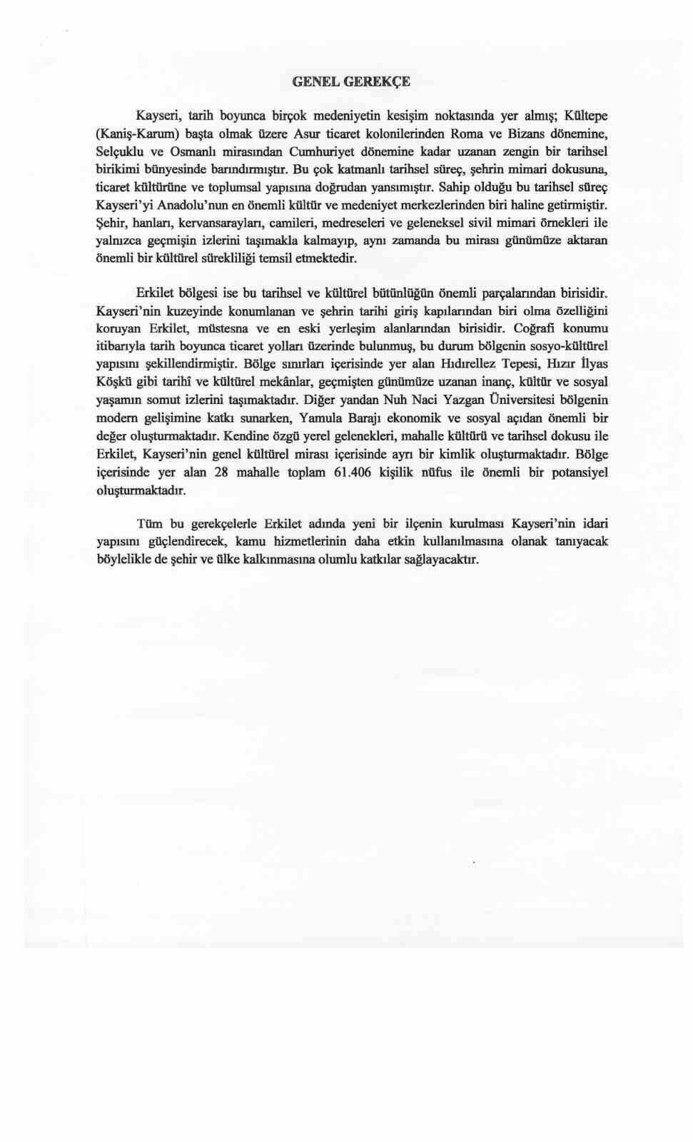 Teklifte, artan nüfus, genişleyen yerleşim alanları ve kamu hizmetlerine erişimde yaşanan yoğunluk gerekçe gösterilerek, söz konusu bölgelerin müstakil birer ilçe haline getirilmesinin hizmetlerin daha etkin ve verimli sunulmasına katkı sağlayacağı ifade edildi. Kayseri’nin tarih boyunca önemli medeniyetlere ev sahipliği yaptığına dikkat çekilen teklifte, özellikle Kültepe gibi merkezlerin şehrin köklü geçmişini ortaya koyduğu vurgulandı. Bu tarihsel birikimin günümüzde artan nüfus ve ekonomik gelişimle birlikte yeni bir idari düzenlemeyi gerekli kıldığı belirtilirken, Gesi ve Erkilet bölgelerinin sahip olduğu potansiyelin altı çizildi. Teklifte Erkilet’in, Hıdırellez Tepesi, Hızır İlyas Köşkü ve Yamula Barajı gibi önemli noktalarıyla dikkat çektiği, aynı zamanda Nuh Naci Yazgan Üniversitesi ile eğitim alanında da gelişim gösterdiği ifade edildi. Gesi’nin ise tarihi dokusu, doğal yapısı ve kültürel değerleriyle öne çıkan bir yerleşim alanı olduğu kaydedildi.