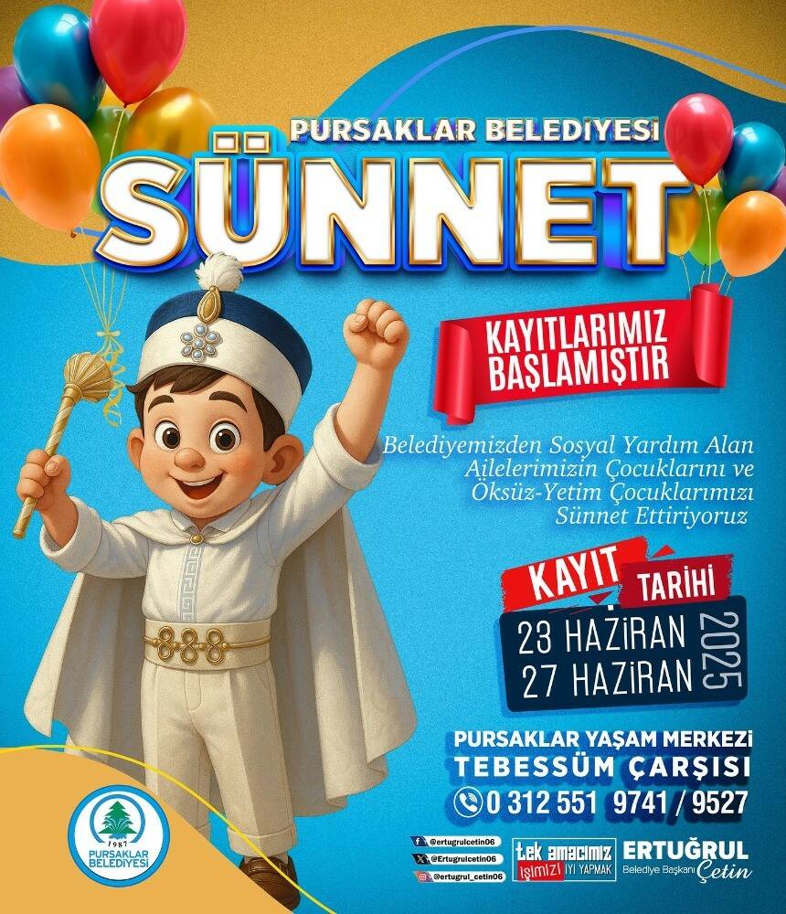 Pursaklar Belediyesi, sosyal sorumluluk projeleri kapsamında, sosyal yardım alan ailelerin çocukları ile öksüz ve yetim çocukları sünnet ettirmek için kayıtları almaya başladı.