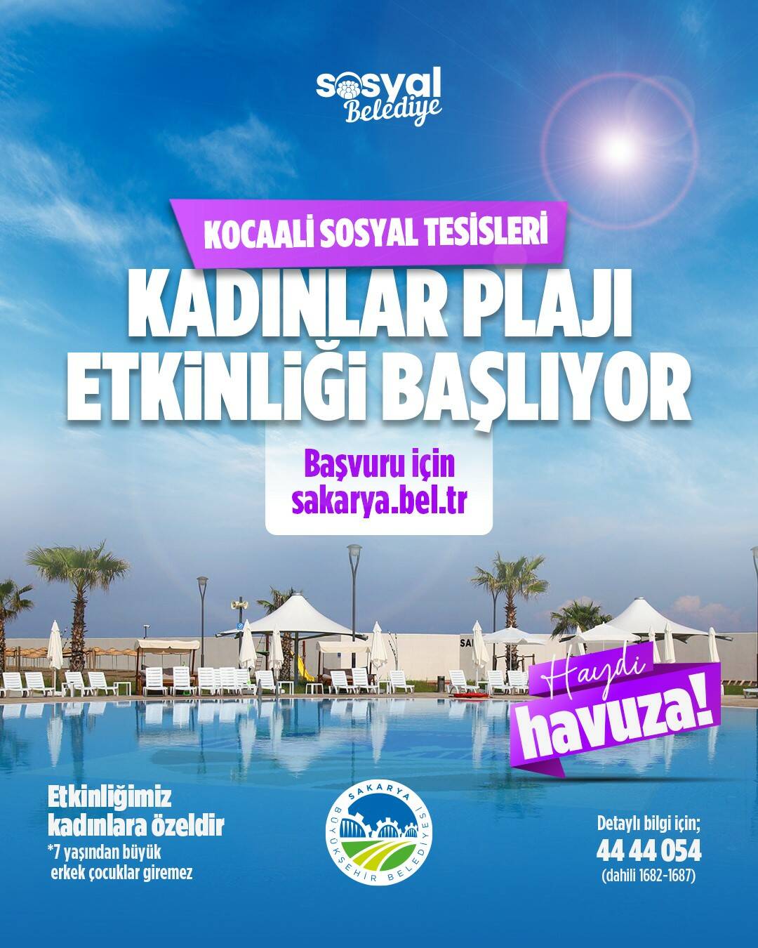 Sosyal belediyecilik çalışmalarına bir yenisini daha ekleyen Sakarya Büyükşehir Belediyesi, yaz sezonu boyunca her çarşamba ve perşembe günü kadınları ücretsiz olarak Kocaali Sosyal Tesisleri ve Kadınlar Plajı’nda ücretsiz olarak misafir edecek. 25 ve 26 Haziran tarihlerinde yapılacak ilk etkinliklere kayıtlar www.sakarya.bel.tr adresinden başlayacak.