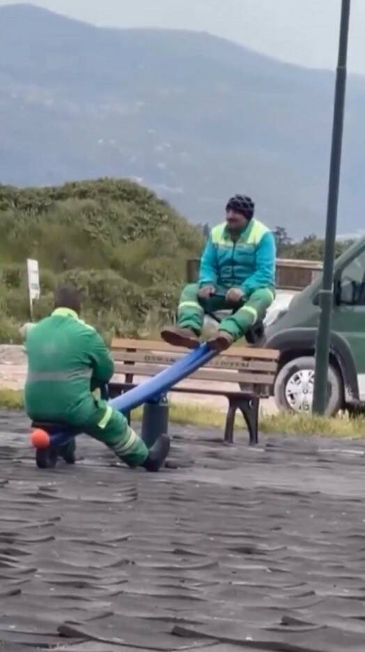 Bursa’da görev yapan belediye temizlik işçilerinin iş arası verdikleri kısa molada tahterevalliye binerek sergiledikleri samimi görüntüler gündem oldu.