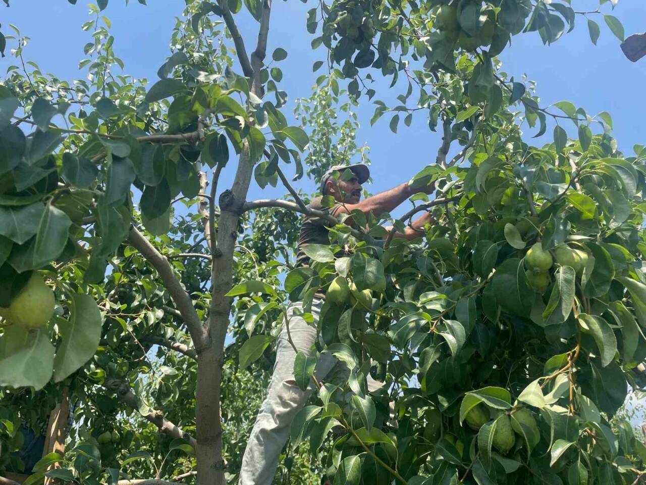 “Hasat öncesi bahçelerde en önemli çalışmalardan birin yapıyoruz. Seyreltme ya da tekleme denen bu çalışmada topak halindeki armutlardan soğuk pası ve kara leke olanları, küçükleri ayırıp, koparıp yere atıyoruz. Şeftalide de yan yana bulunan olgunlaşmamış meyvelerden bazıları koparıp uzaklaştırıyoruz. Bunun için tarım işçileri getiriliyor. Sabah 07.00’de bahçeye geliyorlar akşam 17.00’ye kadar çalışıyorlar.”