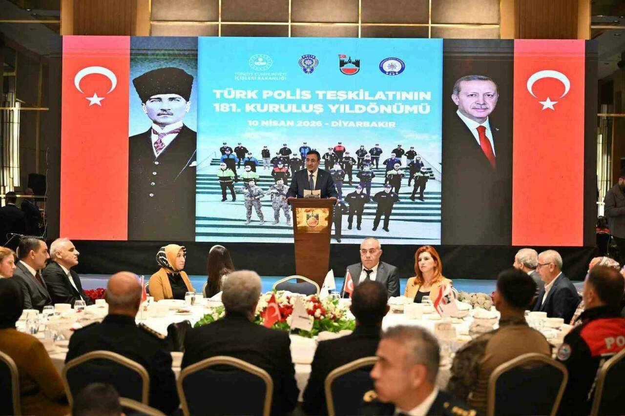 Bir dizi ziyaretlerde bulunmak üzere Diyarbakır’a gelen Cumhurbaşkanı Yardımcısı Cevdet Yılmaz, bir otelde düzenlenen 10 Nisan Türk Polis Teşkilatı’nın kuruluşunun 181’inci yıl dönümü dolayısıyla düzenlenen programa katıldı. Kur’an-ı Kerim tilavetinin ardından başlayan programda konuşan Cumhurbaşkanı Yardımcısı Yılmaz, köklü bir devlet geleneğinin içinden süzülerek bugünlere gelen Türk Polis Teşkilatının, 10 Nisan 1845’te atılan modern temelleriyle milletin huzur ve güvenliğinin teminatı olduğunu ifade etti. Osmanlı’dan cumhuriyete uzanan bu süreklilik içinde polis teşkilatının, değişen şartlara uyum sağlayarak kurumsal yapısının her dönem daha da güçlendiğini vurgulayan Cumhurbaşkanı Yardımcısı Yılmaz, “Tarihimizin en kritik eşiklerinde, özellikle milli mücadele yıllarında üstlendiği sorumluluklarla bu milletin yürüyüşüne eşlik eden emniyet teşkilatımız, cumhuriyetle birlikte hukuk devleti anlayışı çerçevesinde daha sağlam bir zemine kavuşmuştur. Bugün Türk polisi, sahip olduğu tecrübe, yetişmiş insan kaynağı ve gelişen imkanlarla, değişen tehditlere karşı güçlü bir kapasiteyle hareket etmekte, milletimizin huzurunu ve kamu düzenini kararlılıkla korumaktadır. Bu köklü birikim ve güçlü irade, Emniyet Teşkilatımızı bugün de devletimizin sahadaki en etkin ve en güvenilir yapı taşlarından biri haline getirmektedir. Bu toprakları bizlere vatan kılan, bayrağımızın semalarda özgürce dalgalanmasını sağlayan asıl güç, sarsılmaz bir imanın ve sönmeyen bir vatan sevdasının neticesidir. Her bir polisimiz, bu mukaddes nöbeti devralırken canını ortaya koymakta, milletimizin bekası için bir gül bahçesine girercesine şehadete yürümeyi göze almaktadır. Bizler, bu kahramanların gösterdiği eşsiz fedakârlığın karşılığını asla tam olarak ödeyemeyeceğimizin bilincindeyiz” diye konuştu.